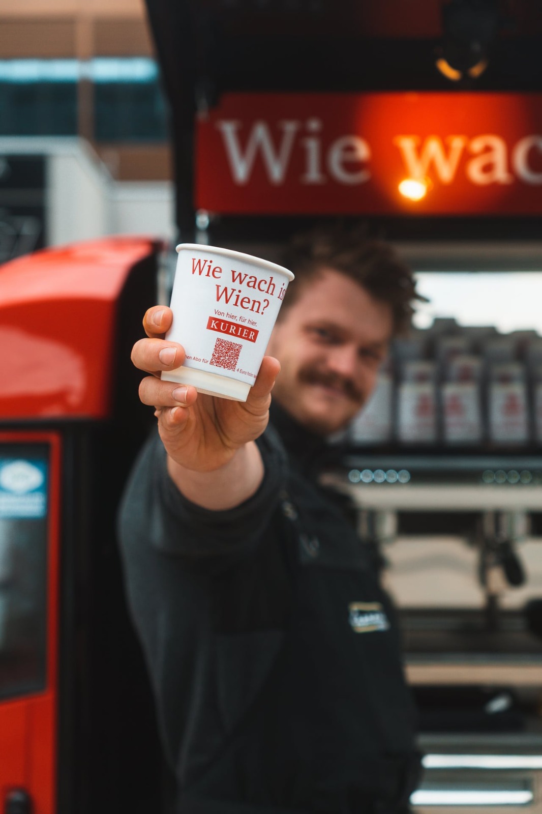 Unser Promotion-Team verteilt leere, gebrandete Becher an dein Zielpublikum und führt sie direkt zur Espressomobil-Einheit. Dort wird der Becher mit Kaffee und Markenbotschaftgefüllt und aus einem simplen Give-away wird ein echter Kontaktmoment.